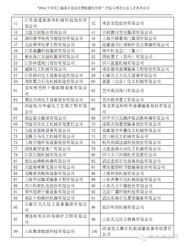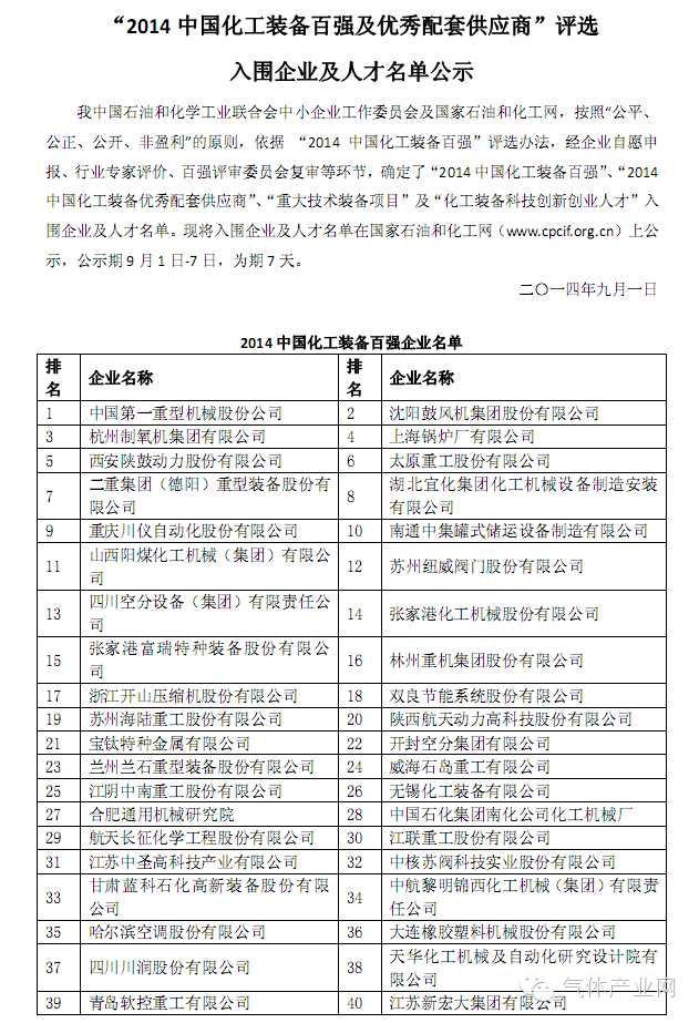 由中国石油和化学工业联合会中小企业工作委员会及国家石油和化工网,按照“公平、公正、公开、非盈利”的原则,依据“2014中国化工装备百强”评选办法,经企业自愿申报、行业专家评价、百强评审委员会复审等环节,确定了“2014中国化工装备百强”、“2014中国化工装备优秀配套供应商”、“重大技术装备项目”及“化工装备科技创新创业人才”入围企业及人才名单。现将入围企业及人才名单公示。